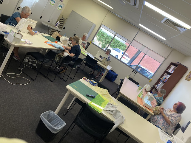 I also found a quilt kit in a bag when cleaning the shed. It had all the blocks made. The top had started to be assembled. There was a large piece of blue fabric which was enough for the sashing and bindings. So I laid them out and we started to sew them together. 1 top was done. A member has taken it home to put on the borders, quilt it and bind it. Amazing.
